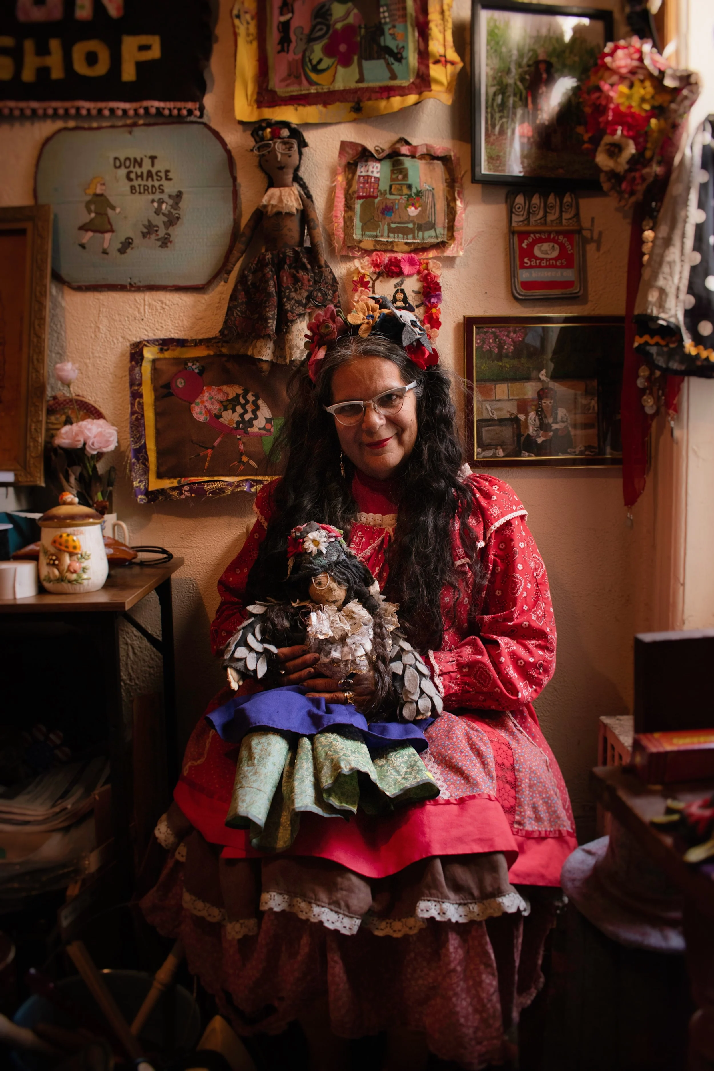 What makes her art feel so alive is that it’s not just something she does, it’s how she lives. Tina makes all of her own clothes, often sewing by hand. Her outfits, like her art, are complex, layered, and expressive. Her home is just as full of feeling, filled with puppets, paintings, fan art, and hand-sewn creatures, all inspired by pigeons. Her deep connection to her Mexican heritage and religion, especially the Virgin of Guadalupe, adds warmth and color to everything she creates. Her life is an extension of her work, and her work is an extension of her care. Her art is also deeply feminist in the quiet power of nurturing, noticing, and protecting what others overlook.